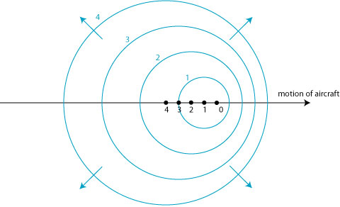 The wavefronts emanated by the aircraft at different times are numbered corresponding to their point of origin.