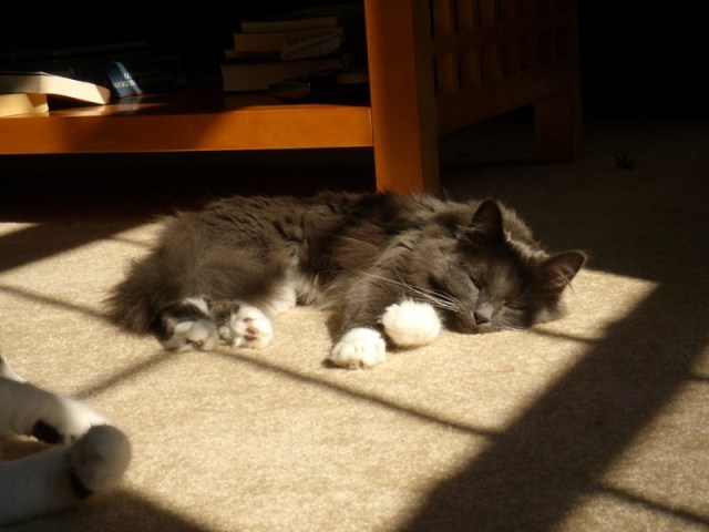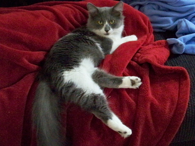 She’s quite the little sweetie-cat! Last night I stayed up late playing videogames, and I had Sophie on my lap or lying asleep against my leg for several hours. She had a busy day of playing!