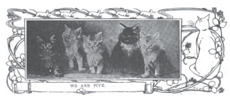The image is from The Harmsworth Monthly Pictorial Magazine, vol. 1 (1898-1899), at the end of the introduction to the magazine by Alfred C. Harmsworth. This seems to be an early version of an LOLcat, popularized by I Can Has Cheezburger! Though I wouldn’t exactly call it “laugh out loud”, the picture is a captioned image of cats with the caption in the cat’s own voice (hence the “we”).