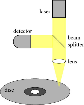 Light from a laser passes through a beam splitter and is focused by a lens onto the disc. Part of the back-reflected light gets directed by the splitter to the detector, and the absence or presence of light at the detector registers as a ‘1’ bit or ‘0’ bit.