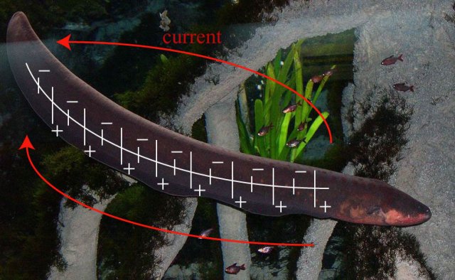 These tests established not only the identity of the Gymnotus’ shock with common electricity, but also gave insight into the location of origin of the charge and the direction of flow.  In essence, the Gymnotus acts like a long voltaic pile, with the positive end at the head.  When the shock is released, the current flows from the head to the tail (eel image source):