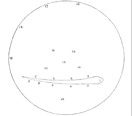 By the help of the accompanying diagram I will state a few experimental results which illustrate the current around the fish, and show the cause of the difference in character of the shock occasioned by the various ways in which the person is connected with the animal, or his position altered with respect to it. The large circle represents the tub in which the animal is confined; its diameter is forty-six inches, and the depth of water in it three inches and a half; it is supported on dry wooden legs. The figures represent the places where the hands or the disc conductors were applied, and where they are close to the figure of the animal, it implies that contact with the fish was made. I will designate different persons by A, B, C, &c., A being the person who excited the fish to action.