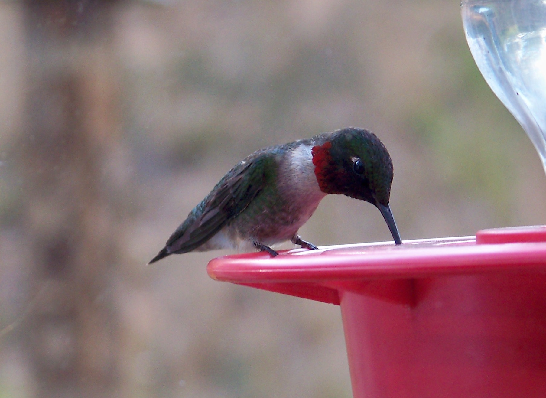 This shot was a bit of quirky luck: I had seen the birds buzzing in and out of the feeder several times during the day, but they usually take off when they see me moving in the house.  On a random whim, I suddenly decided to grab the camera and stand, motionless, pointing at the feeder, just in case one went by.  This was really a long shot, since they come by perhaps several times a day at most, but within a minute of me standing there, the fellow pictured above stopped in for a drink!