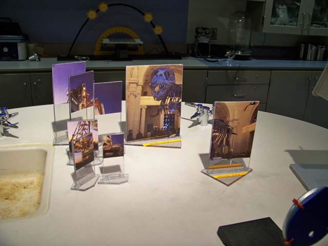 I only want to discuss one more, though; the anamorphic imaging display! Kids get to work with an “optical jigsaw puzzle”; if they place the different-sized pieces in the right positions relative to an observation point, they can see the undistorted whole image! A picture of the setup is shown below: