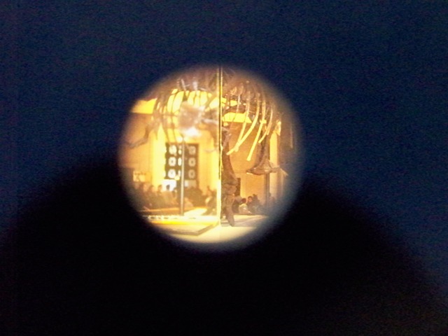 This was the idea I suggested, based on my anamorphic imaging blog post! (I even helped crunch the numbers and provided a familiar tyrannosaurus picture for the two-piece puzzle.) I tried to take a picture of the anamorphic effect through the observation hole, but it was a little too small for my camera:
