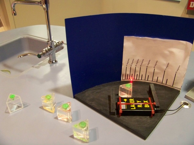 One station allows kids to learn about the idea of refraction, and Snell’s law! Plastic prisms filled with different liquids can be placed in the path of a laser beam, and from the angle of refraction the refractive index of the liquids can be deduced: