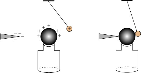 A schematic of the experiment and its interpretation is given below. The positively-charged glass tube is brought to the shot, stripping it of some of its free electrons. Being grounded itself on the glass, it becomes positively charged, as does the cork that is pressed against it. The positively-charged cork is repelled from the positively-charged shot and therefore hangs away from it. With a small azimuthal impetus, it could even be made to “orbit” the shot!