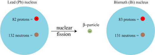 Polonium in turn decays into a radioactive form of lead, and that lead decays via beta decay — the release of a high-velocity electron, turning a neutron into a proton: