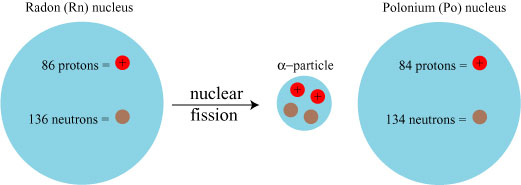 There are three methods by which a heavy atom can shed this excess energy; these processes are known as “alpha”, “beta” and “gamma” decay, the mysterious names a reflection of the historical fact that nobody knew what they were!  Alpha decay is the release of an alpha particle (aka a helium nucleus: 2 protons, 2 neutrons) from the radioactive nucleus, as is the case in the decay of radium: