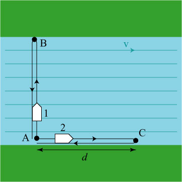 Each boat has a top speed of c, and the river flows to the right with velocity v. Boat 1 travels a distance d from point A to point B, and then returns, while boat 2 travels a distance d from point A to point C, and then returns. How long does it take each boat to return to the starting point? Boat 2 moves very fast with the current on the way to C, but moves very slow against it on the way back. Boat 1 must steer partly upstream in order to cancel the motion of the river, and its speed across the river is somewhat reduced: