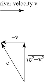 Each boat has a top speed of c, and the river flows to the right with velocity v. Boat 1 travels a distance d from point A to point B, and then returns, while boat 2 travels a distance d from point A to point C, and then returns. How long does it take each boat to return to the starting point? We can use a little geometry and velocity addition to determine this. Boat 2 will have a total velocity of c + v on the way out to point C, and will have a total velocity c – v on the way back. Boat 1′s velocity is slightly more difficult to calculate; in order to travel straight across the river, it must have a velocity v against the river flow, and a total velocity of c. Using some simple geometry,