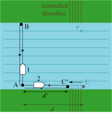 So the marker buoy at C ends up getting pushed to the point C’, and boat 2 has to move a shorter distance d’ instead of distance d. If d’ is just the right value, the two boats will take the same amount of time to perform their round trips.