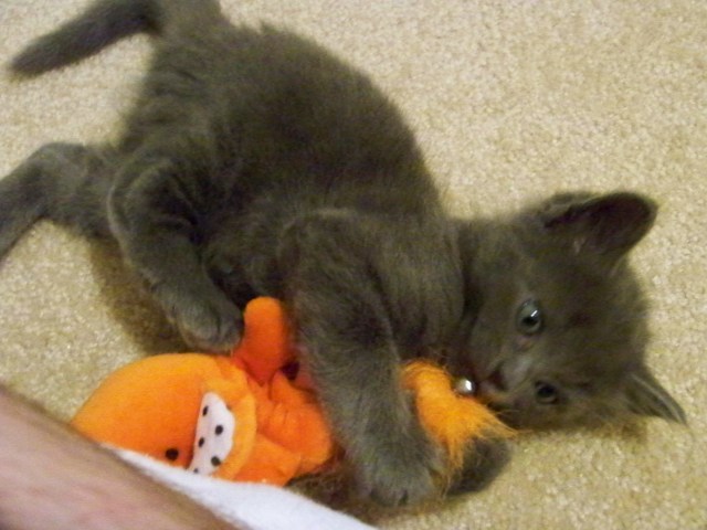 This wasn’t a typical shot of Rascal, who in general is a wild and crazy boy! When I was taking pictures, he was just awakening from a nap and not particularly inclined to run around. Here is a more typical picture, taken at six weeks, that shows his tendency to attack us!