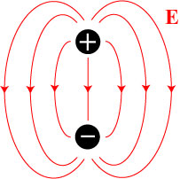 Because a dipole has a spatial structure, it also has an orientation; the direction of a dipole is typically indicated by an arrow pointing from the negative charge to the positive charge.  A dipole produces an electric field, indicated by arrows in the following picture, which in turn creates a force on other charged particles: