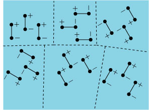 This alignment must be local, because without an external electrical influence, we expect water to be electrically neutral.  Our earlier picture can be crudely revised as shown below, in which molecules are locally parallel in small regions, but different regions have different orientations.  The net result is the same, in that every dipole has, on average, another nearby dipole that cancels it out!