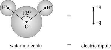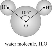 The hydrogen atoms form a 105° angle with respect to the center of the oxygen molecule.  Though the molecule is overall electrically neutral (the amount of positive charge is the same as the negative charge), the oxygen atom exerts a stronger pull on the electrons than the hydrogen atoms do, and the negative charge therefore tends to group around it.  This leaves the hydrogen atoms on average positively charged and the oxygen atom negatively charged, and the resulting structure is what is known as an electric dipole.  The term “dipole” = “two poles”, referring to the fact that the charge distribution consists effectively of two distinct separated charges of opposite sign.   It is often drawn in a simple “ball-and-stick” form, as shown below: