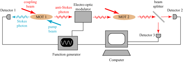 The fundamental components of the system are a pair of magneto-optical traps (MOT) containing Rubidium atoms. Magneto-optical traps use light and magnetic fields to localize a group of atoms and cool them to a low temperature, forming a low-density medium. The first MOT is excited by a pair of lasers — a pump beam and a coupling beam — and through a complicated light-matter interaction pairs of photons are produced. The physics of this production is too complicated to discuss here, but the result is a higher frequency “Stokes photon” and a lower-frequency “anti-Stokes photon”. These photons are produced at the same time and are therefore correlated in time.