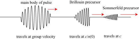 At the beginning of the 20th century, physicists Arnold Sommerfeld and Léon Brillouin independently performed theoretical work to investigate what happens to such sharp-edged pulses as they propagate a long distance through matter. In 1914, they each published results** showing that the main body of the pulse (traveling at the group velocity) is preceded by faster-moving waves, now known as “precursors”. The precursors are general broken into two types: the Sommerfeld precursor, which actually travels at the vacuum speed of light , and the Brillouin precursor, which travels at the speed of light