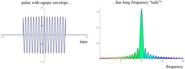 This pulse has a large central peak in frequency, but also has long frequency “tails” that stretch out, to some degree, to arbitrarily high frequencies (to infinity) and arbitrarily low frequencies (to zero). These tails arise due to the instantaneous start and end of the pulse in time: the rapid rise and fall that give the “square pulse” its name.