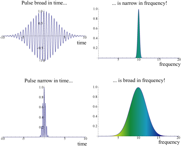 Physicists use roughly analogous definitions to characterize the speed of light in matter. Instead of “droplets”, a pulse of light can be decomposed into a collection of waves of different frequencies (colors). It can be shown that a narrow pulse of light necessarily consists of a very broad spectrum (range of colors), while a very broad, slowly varying pulse has a narrow spectrum. Also, and significant for our later discussion, a pulse with a very sharp edge necessarily has a very broad spectrum, as well. This idea is illustrated crudely below: