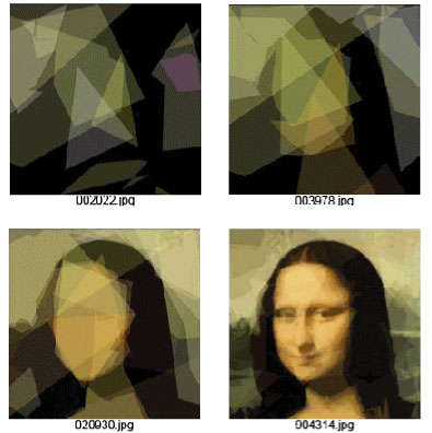 The total number of polygons is a little misleading, because it seems that the number of polygon sides was allowed to be arbitrarily large in the simulation. Nevertheless, a quite accurate representation of the Mona Lisa was produced with a surprisingly small amount of information. This genetic algorithm works as a very crude and inefficient form of image compression, replacing the large amount of pixel information in the image with a relatively small amount of structural information, namely an arrangement of polygons. (You can run a similar algorithm on your favorite pictures at this website.)