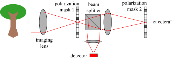 The masks described here are somewhat inefficient, in that they block a significant fraction of the light incident upon them, and that light is completely lost. Anyone who has ever taken a crappy digital photograph in a dark room can appreciate that light is sometimes hard to come by, and throwing it away is a very poor strategy! A less wasteful strategy for compressive sensing is to perform what is known as “photon sharing”, in which the mask is an array of polarization-changing elements.