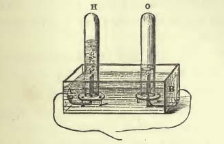 When we get to a discussion of the force of “chemical affinity”, the tendency of atoms of different type to join together, Faraday really enters his element! Much of his efforts focus on the decomposition of water (H2O) into its constituent elements, two atoms of hydrogen and one atom of oxygen. This relationship — two hydrogen for every single oxygen — is illustrated beautifully when he breaks up water using electricity! With the electrical poles submerged in water, he puts closed chambers above them to trap the escaping gasses. He finds that twice as much water has been pushed out of one tube as compared with the other, suggesting twice as much gas has been released into it: