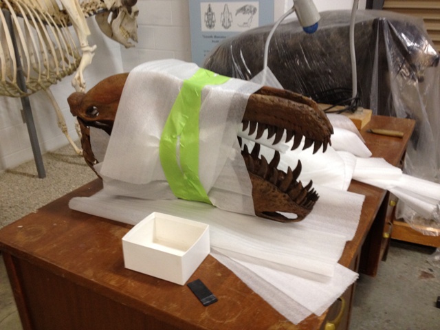I should mention that one of the bonus joys of the tour was going through the museum with Brian Switek of Laelaps and Scicurious of The Scicurious Brain!  Scicurious’ enthusiasm is infectious, and she was filled with fascinating questions that the guides were often hard-pressed to answer!  Brian’s paleontology expertise really showed when looking at the fossils, and he had many intriguing observations to make about specimens that were otherwise unlabeled.  For instance, he spotted the skull of a juvenile Tyrannosaurus Rex wrapped up off to one side: