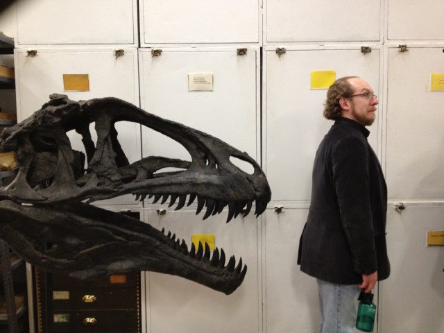 Other impressive specimens abound!  One of the jewels of the museum’s collection is an Acrocanthosaurus skeleton (Dr. Matthew Francis’ head in photo for scale):