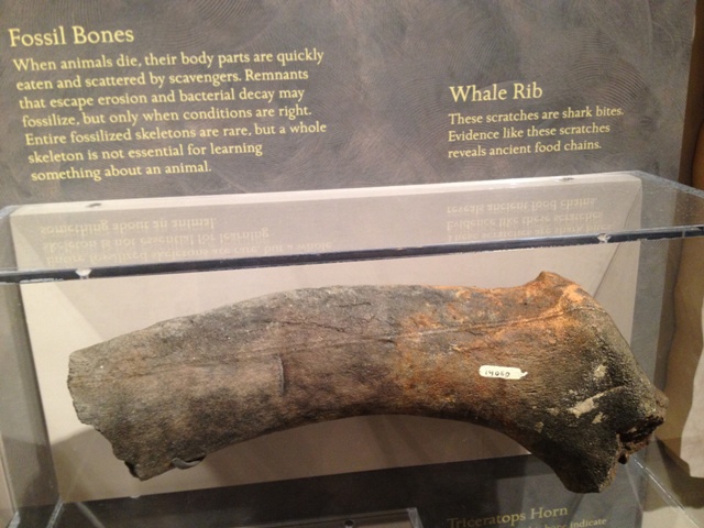 The bones of animals are more than decoration; they can often provide evidence of an animal’s life and travails.  For instance, later in our tour, we were shown a fossilized whale rib, which has scratches on it from shark teeth: