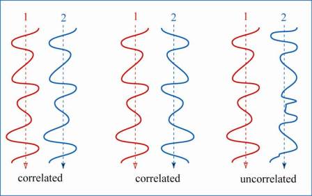 However, if one does this experiment with an ordinary light source, like a light bulb, the interference pattern will almost certainly not be seen. The reason for this is that a light bulb produces light that has different wave vibrations at different points in space — the light reaching the two slits in Young’s experiment are uncorrelated, or spatially incoherent. A crude illustration of the difference between correlated and uncorrelated waves is shown below; basically, correlated waves are doing the same thing, and uncorrelated waves are “doing their own thing”.