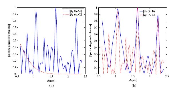 The left figure above shows the degree of coherence — 0 for completely incoherent, 1 for fully coherent — between the holes A and C as a function of the array spacing , and compares it to what the degree of coherence would look like in the absence of plasmons (dashed line). It can be seen that for certain hole separations, the spatial coherence increases dramatically. In the right figure, we see the degree of coherence compared for holes A and B and for holes A and C as a function of array spacing. It can be seen that, for certain values of