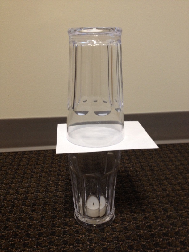 Put the candle in one of the glasses, and light it. Place the other glass on the top of the first, with the wet piece of paper between them; this paper will help form an airtight seal between the glasses. The candle will slowly consume all of the available oxygen in the glasses, and be extinguished. If you have done things correctly, you will find that the glasses are strongly stuck together due to the drop of atmospheric pressure inside! If you have set up a really good seal, it might be impossible to pull the glasses apart by hand — they can be twisted apart in this case.