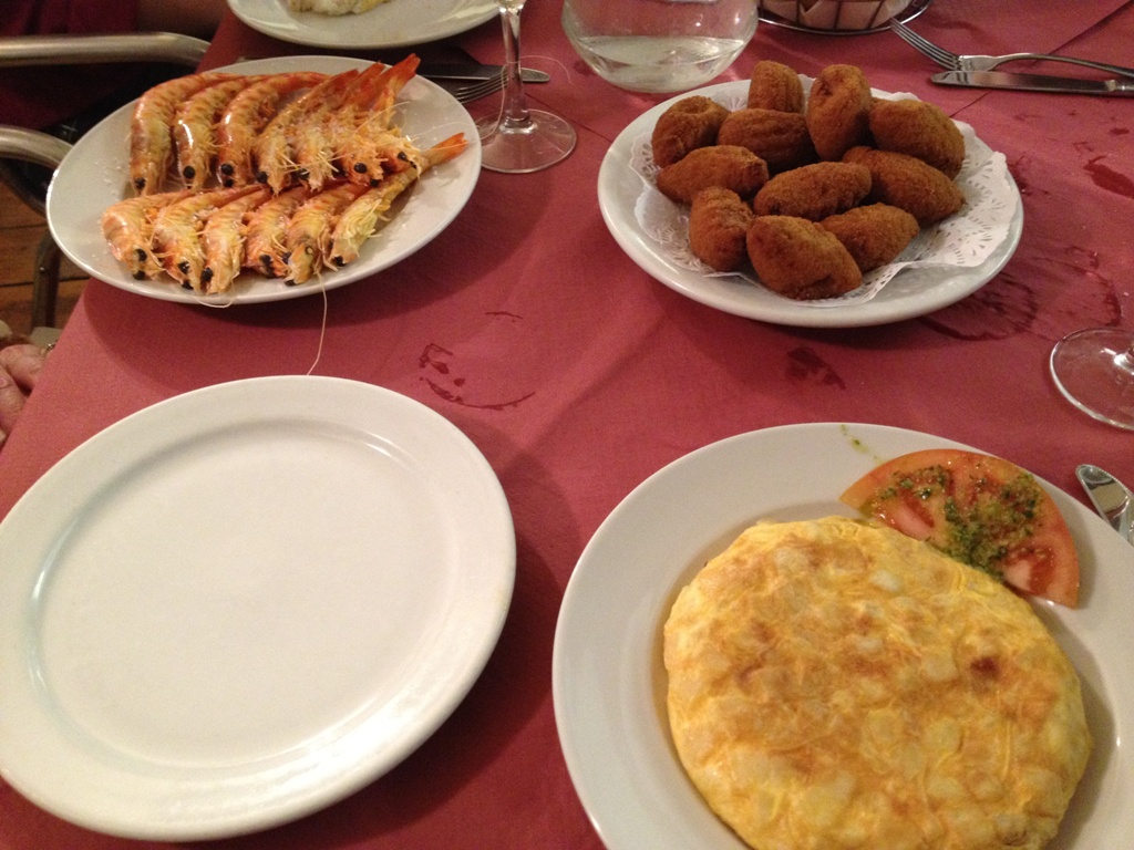 The upper left corner is a plate of prawns (niece-in-law #2 was appalled by the huge eyes on them), and the other two plates are traditional Spanish tapas: croquetas on the top and a Spanish tortilla on the bottom. I loved both of these plates and ate them almost every day, eventually burning out on them by the end of the trip!