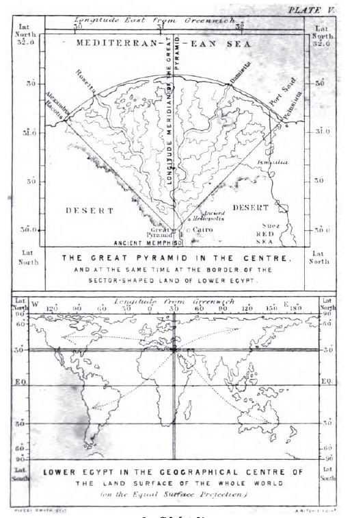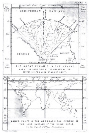 Smyth goes even further in his belief in pyramid secrets; as the following figure from his book demonstrates, he believed that the Great Pyramid was deliberately placed at Giza as the “geographic center of the land surface of the world”.