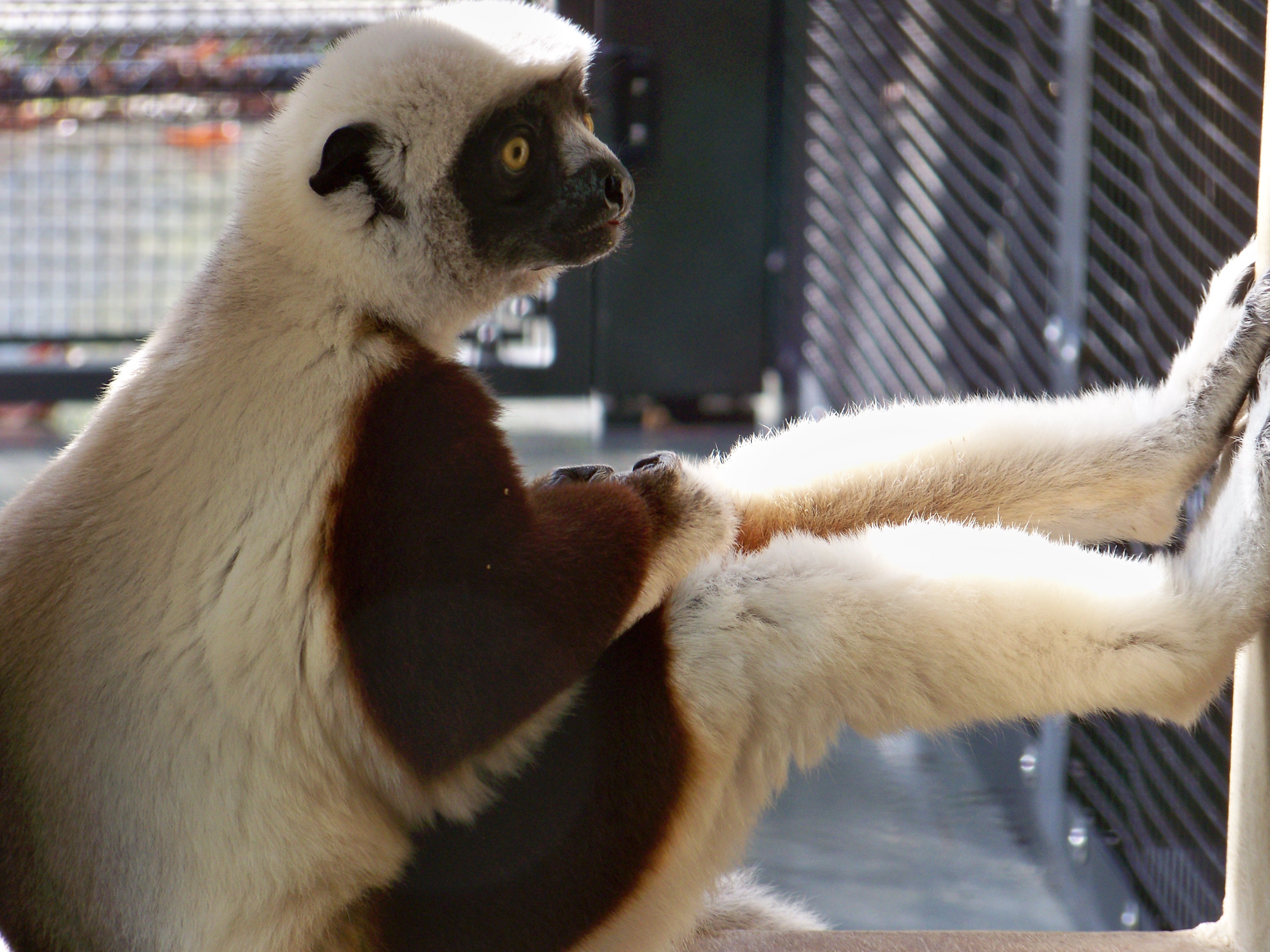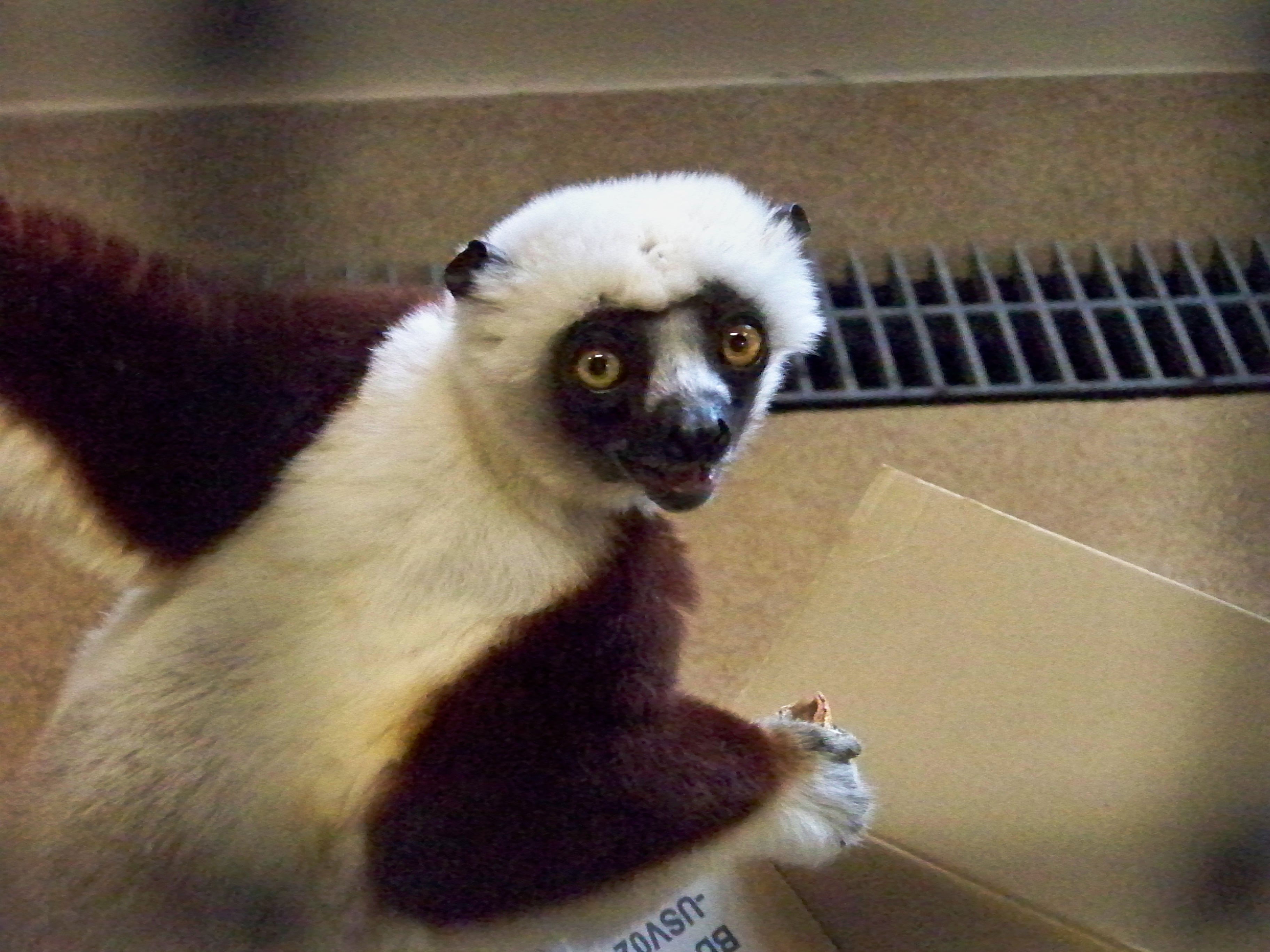 Another bit of exercise was demonstrated by Tiberius, another Coquerel’s sifaka, who was given a box with treats hidden inside. Tiberius would happily dive head first in the box, feet sticking out, and eventually emerge with a treat in hand.