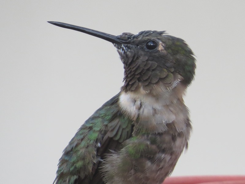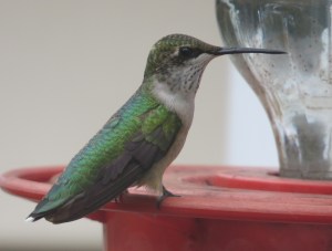 We’ve also had a rather rough-looking male visiting regularly, and most of my pictures are of him.  I was worried that he might be sick, but he seems to be having no trouble at all chasing away other hummingbirds from the feeder.  My clearest picture of him is below.