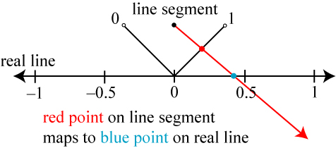 To do so, we take the line segment of points between 0 and 1, and fold it, producing a “kink,” and place it above the infinite real line as shown. Â We then draw another line (shown in red) between the point above the kink that passes through both the line segment and the real line. Â For every point that the red line hits on the real line (in blue), there is a corresponding point (in red) on the line segment. Â As the red line gets more horizontal, it intersects the real line further along its length, in principle hitting it at “infinity” when it hits the point 1 on the line segment.