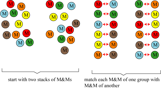 This is a better option for two reasons. Â First, we effectively do half as many mathematical operations, since we do one “matching” for each pair of M&Ms. Â Second, we don’t need to worry about keeping track of the total number of M&Ms at all, only whether every M&M of one pile has a partner in the other.