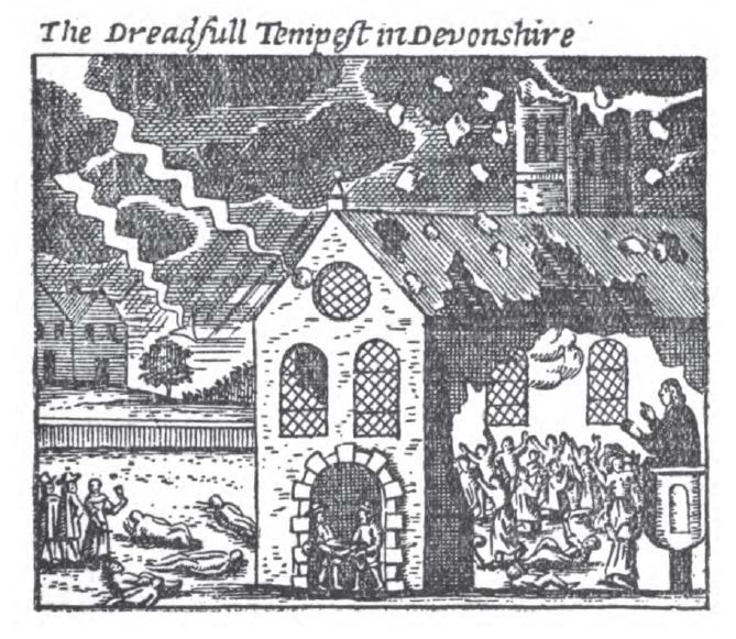 The most devastating example of this is the tragedy that struck during the Great Thunderstorm at Widecombe-in-the-Moor on October 21, 1638.  At least four people were killed and around 60 injured when lightning struck the a church during service, and ball lightning burst through the window and fell among the parishioners. It was a stunning, unthinkable tragedy and, thanks to its instant notoriety, its effects were painstakingly documented.