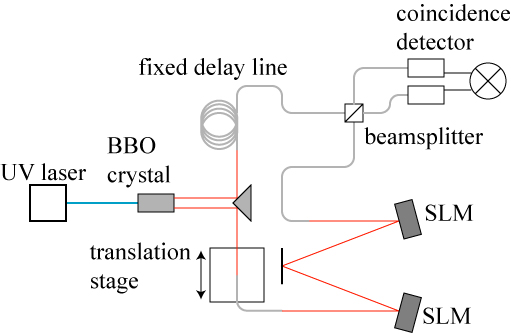 Since it is almost impossible to make an absolute measurement of the time a photon takes to travel over such a short distance, the delays were determined by a coincidence measurement using the Hong-Ou-Mandel effect***.  Explaining this effect would be another post in and of itself, but in short: when two photons enter a beamsplitter at the same time, they tend to leave from the same side of the beamsplitter.  With the coincidence detector only triggering when a photon arrives at two different detectors, the simultaneously arrival of photons is then detected by a drop in the measured coincidence.  Calibrating their system for light which is unstructured, the experimenters then used the SLMs to structure the light,  and determine how much delay needed to be removed, using the translation stage, to return the photons to simultaneous arrival.