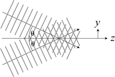 twoplanewavesEach plane wave, individually, is traveling at along the angles θ; in what direction and at what speed is the group of two waves traveling?  There is no net wave propagation along the vertical y-direction, as the upward flow of the one wave is perfectly canceled by the downward flow of the other.  The only travel is in the z-direction, and because part of each plane wave’s velocity is along y, the speed along z is smaller!  Another way to put it: the larger that θ is, the more that the group of waves is traveling along y and the less that they’re traveling along z.