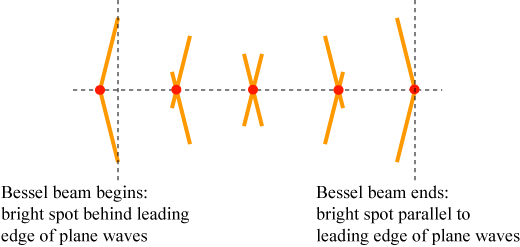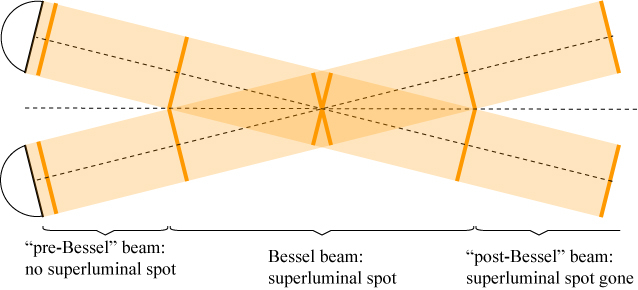 So, in short, the Bessel beam’s superluminal behavior is very much like the scissors paradox: we have something that moves superluminally, but it is always lagging behind the phenomenon that created it in the first place!  In the scissors case, the phenomenon was the force on the scissors; in the Bessel case, the phenomenon is the plane waves creating the bright spot.