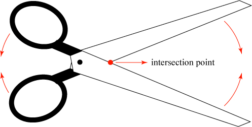 In fact, it occurred to me while writing this post that the characteristic “snip” sound that a pair of scissors makes arises from this acceleration in the speed of cutting: when you first start cutting, the intersection point moves slowly — “sss” — and at the end of cutting the intersection moves fast — “nip!” It is, therefore, a great example of onomatopoeia actually having some physical information built into it.