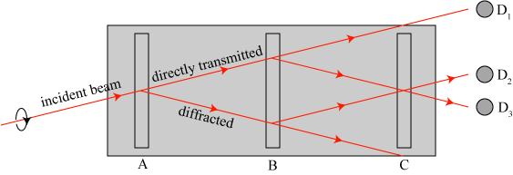 An incident beam of neutrons coming from the left hits disc A and is split into two identical beams, one that is the result of directly transmitted neutrons and one that is the result of diffracted neutrons.  These two beams are split again at disc B, and each sends a diffracted component to disc C where they combine.  The neutron waves that emerge from disc C can interfere with each other, and the counting rates measured at detectors D-2 and D-3 depends on the relative phase between the waves that traveled on the directly transmitted path and the diffracted path.