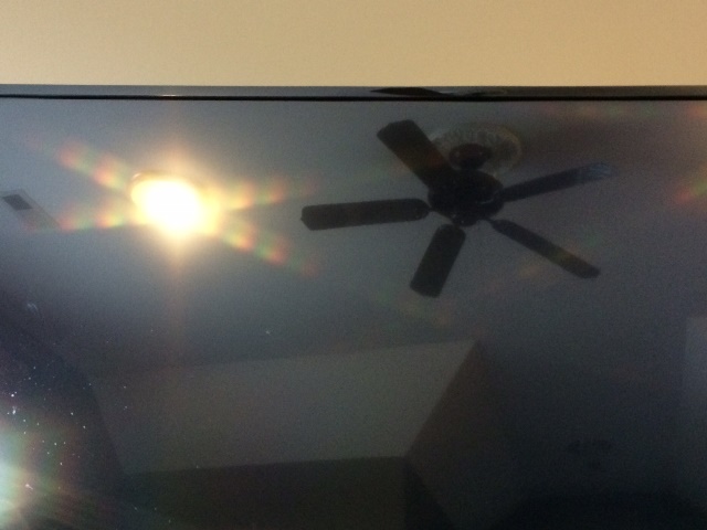 A fan of light, beside the image of an actual fan, in a television screen.