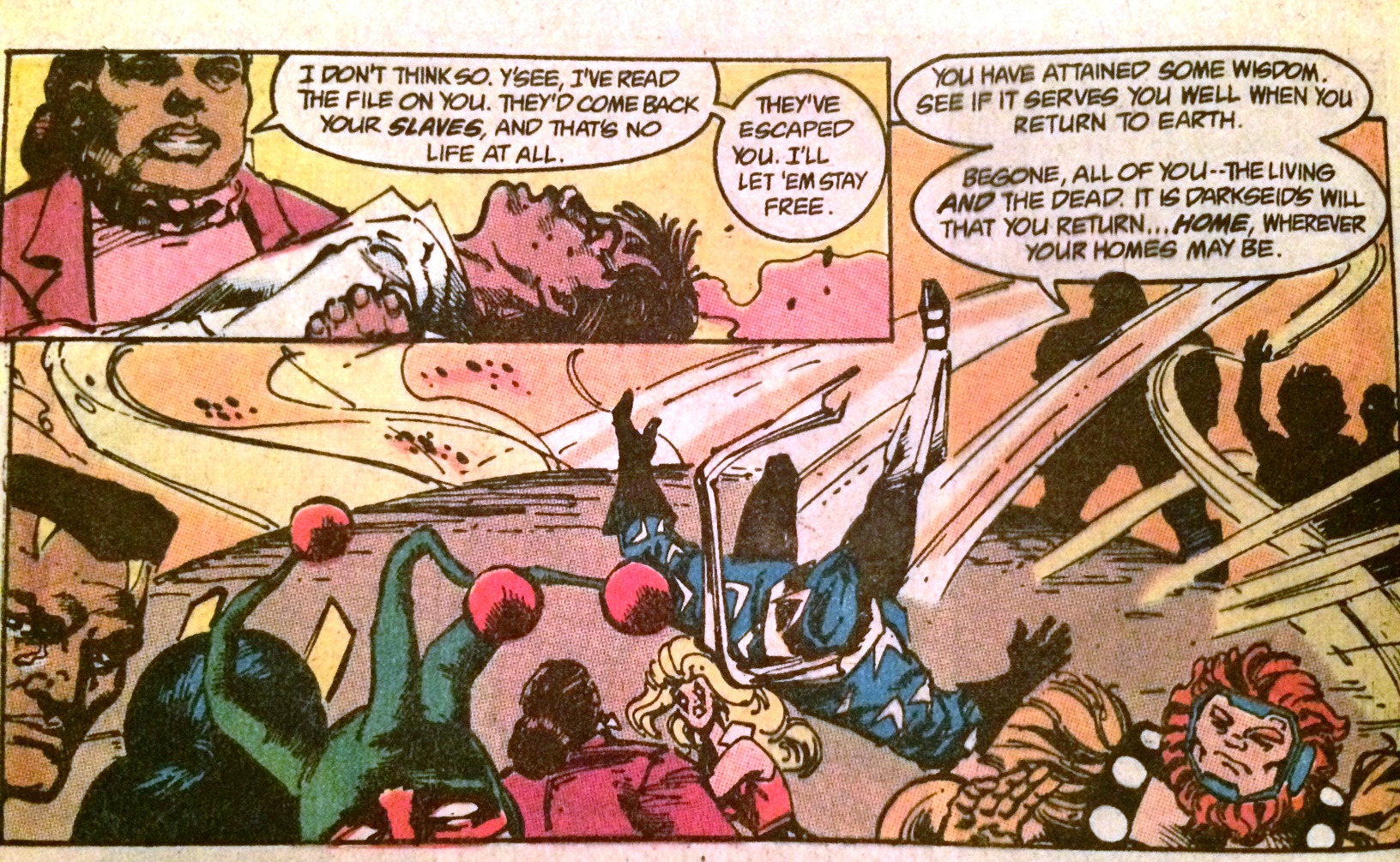 In a later storyline, the Squad, including Waller, gets kidnapped to Apokolips, the world ruled by the evil god Darkseid. No only does Waller pick up an alien gun and start blasting away at bad guys with the best of them, she even stares down Darkseid himself and more or less tells him to get stuffed, as these two snippets show.
