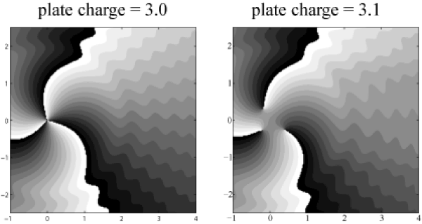 This seems to be precisely what is happening at the critical juncture when the plate charge = 3.5: an infinite “hotel” of vortex pairs is created.  Then, when the plate charge increases beyond 3.5, those charges are paired differently; each vortex gets a different “roommate” to annihilate with.  To put it in simpler terms, this is equivalent to saying that “infinity minus one equals infinity.”