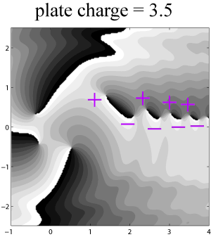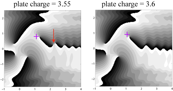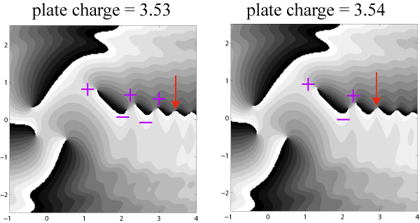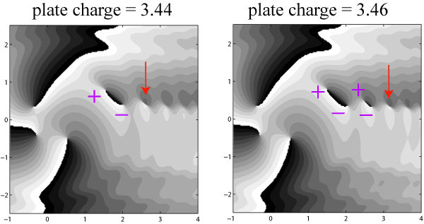 Now let’s increase the plate charge and get really close to 3.5.  At 3.44, we find that a pair of vortices have been created close to the origin — they are labeled in purple — and what appears to be another pair have been created next to them, labeled with a red arrow.  When the plate charge is increased to 3.46, we find that these vortices separate in space, and another pair are created next to them.