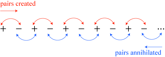 But where did the extra charge come from?  We note the following: the pairs of opposite vortices that were created when the plate charge < 3.5 are joined along a white-black interface.  However, the pairs of opposite vortices that annihilate are ones on adjacent white-black interfaces.  Without all the colors confusing things, the process looks as below.